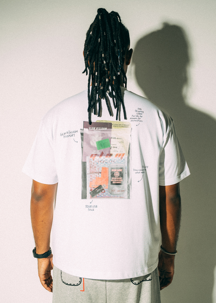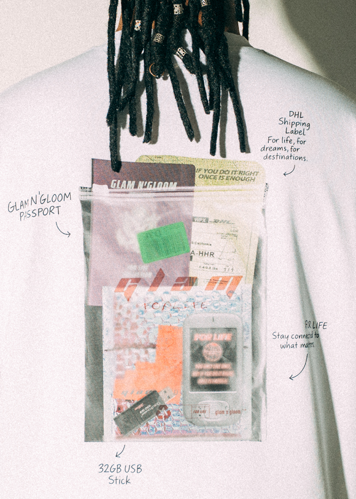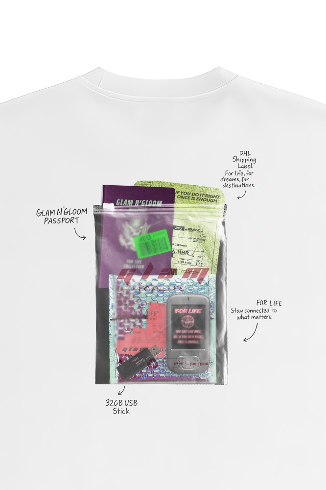 Oversized t-shirt in solid white featuring the Glam n’ Gloom logo on the front for a clean, minimal look. The back showcases a detailed graphic of a transparent bag filled with FOR LIFE essentials — including a custom Glam n’ Gloom passport, DHL shipping label, 32GB USB stick, and a mobile phone with FOR LIFE displayed on the screen — each marked with precise annotations. Every element in the design ties into the collection’s narrative, turning everyday objects into part of the FOR LIFE mission.