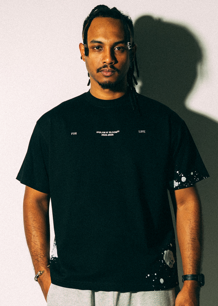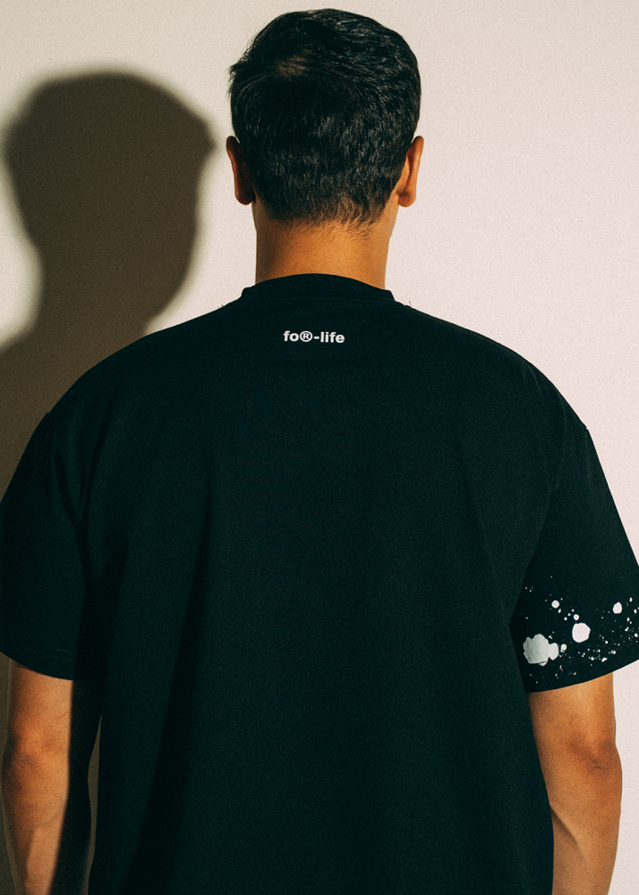Oversized t-shirt in solid black featuring a white paint splatter design, inspired by the look of a painter’s work clothes. The random splashes create a unique pattern on each piece. Finished with a small for life print at the upper back.